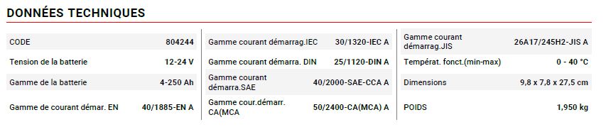 - tests réalisables : état de la batterie, capacité de démarrage (CCA), système de démarrage, circuit alternateur du véhicule ;